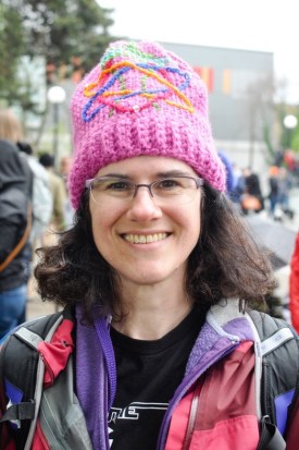 Her bright pink, knitted cap with the ‘March for Science’ logo stands out in the busy crowd and the rest of her attire looks as if she is planning to go hiking right after the march. She is animatedly talking with her friend and her mother who eagerly sneaks in to take a picture of her being interviewed.