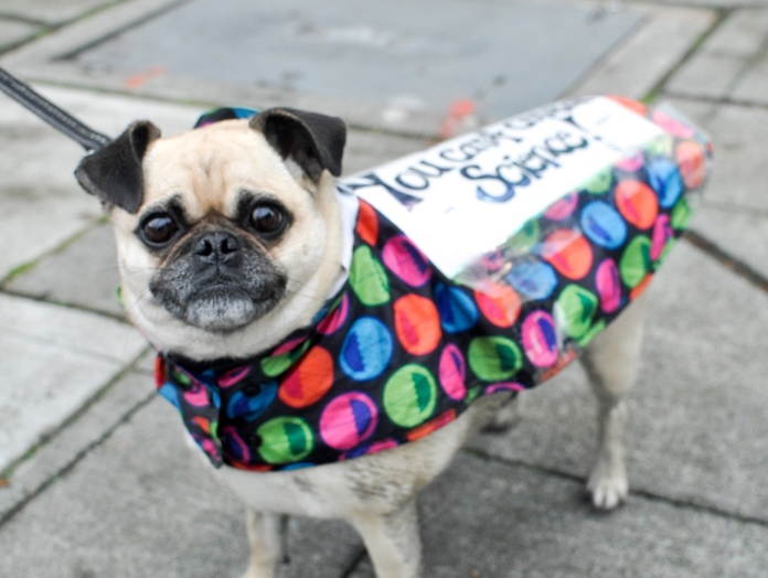 He is well prepared for rain, if a little out of breath and looks like he is ready to go home for a nap. His sign saying, “You can’t censor Science!” is taped to his raincoat, his ears are super floppy, and his nose is super squished.