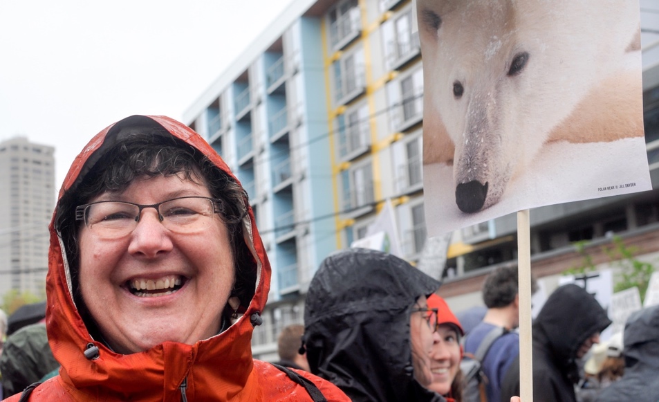 Her sign has a sleepy polar bear on it and she is drenched in the rain. She is excited to be asked for an interview and extra excited to be at the march and her smile shows it clearly. Her answers are well thought out and articulate as if she has put a lot of thought into why she is marching.