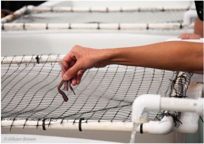 The Kanaloa Octopus Farm is located near the airport on black gravel, with carrier planes doing training runs overhead and a natural energy laboratory next door. A small, tarp-covered, chain link fence surrounds the shelter. Octopus-themed sundries are on sale and a green turf rug covers the gravel. The phone number on the sign is crossed out in black marker and a different one is handwritten below. This farm works to “provide a sustainable source of live cephalopods for aquariums, researchers and saltwater aquarium hobbyists” and is largely funded by the $25-per-person tours it offers every day. Delicate creatures, octopuses are not easy to grow or keep alive, and the people who work here are scientists with advanced degrees and a passion for the creatures.