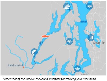 I recently decided to join a team and sponsor a steelhead in the name of conservation. Every spring, Long Live the Kings hosts its Survive the Sound campaign to increase awareness about steelhead survival and raise money for conservation efforts. The campaign is essentially an interactive web challenge that uses data from tagged, migrating steelhead smolts (juveniles) to allow individuals or teams to sponsor a steelhead. Once you decide to sponsor, you can create your own fish avatar, track its migration, and see if it survives.