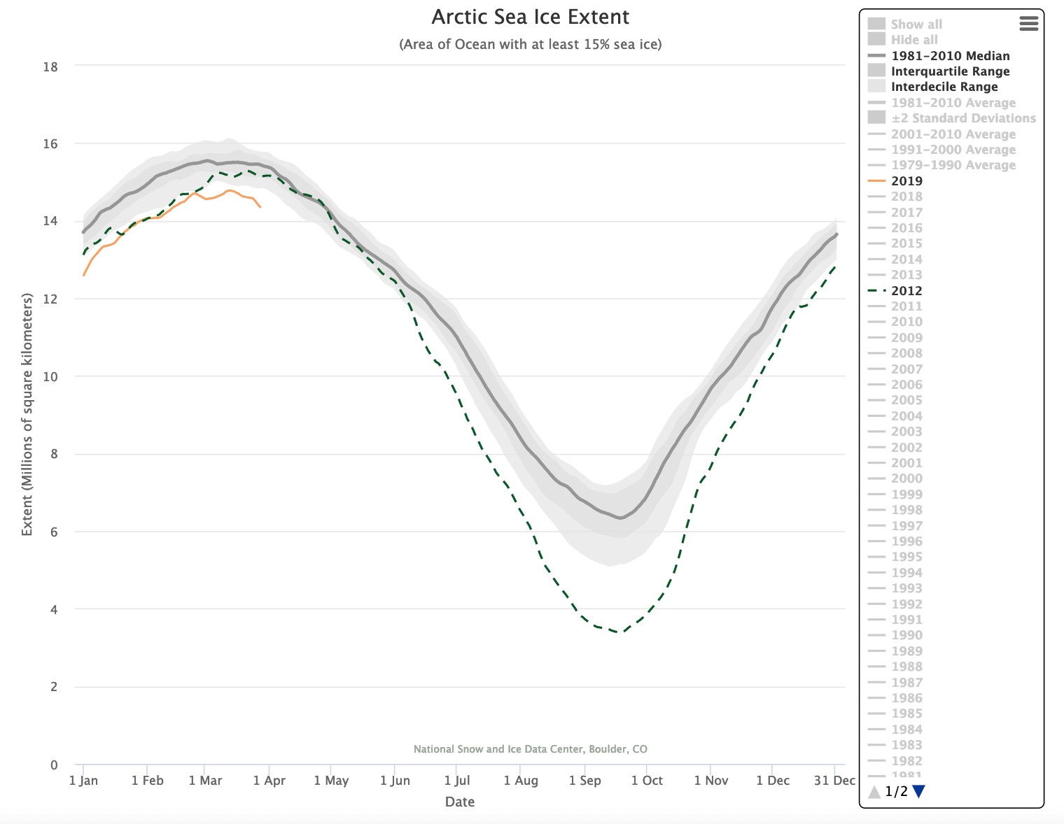 Each fall, as temperatures drop and the sun dips below the horizon for months on end, annual sea ice begins to form as the ocean freezes. Nearly all of the Arctic Ocean is frozen over by the end of winter, so the typical maximum ice extent is observed in March. In the spring, as the sunlight begins to return and with it, warmer temperatures, the same ice that froze in the fall begins to melt, so that by September the extent of sea ice is at its minimum. When we look back at the satellite record, we can compare the ice extent from 1979-2012 and see a net loss of two million square kilometers of ice in the summer.