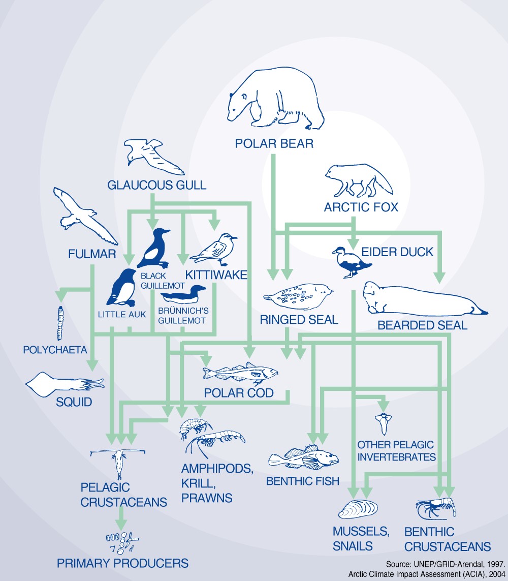 As the ice continues to retreat and the open ocean is revealed, phytoplankton in the water column experience a similar burst of production due to sunlight and nutrients now available from ocean mixing. The phytoplankton are consumed by zooplankton, which are consumed by bowhead whales, sea birds, Arctic cod and other fish. These fish form a critical food source for ringed seals, black guillemots, belugas, narwhals and other predators. As the apex predator in the ecosystem, polar bears depend directly on the production of the ice algae and phytoplankton blooms that support their prey: seals, walrus, and occasionally narwhals and belugas. This short period of productivity in the spring is essential to sustain the entire Arctic ecosystem. Many Arctic species, like seals and polar bears, consume nearly all of their food for the year during the few short months when the receding annual ice is brimming with life.