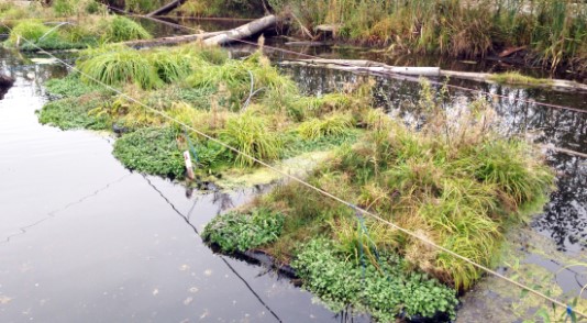 Seattle’s Duwamish River estuary has something new afloat along the shorelines. If you have the chance to visit the river this spring, you might see several structures holding large, square mats of wood straw, biodegradable foam, and other natural materials tethered to piles near the river’s edge. You might also see me or other team members perched on the wooden frames, counting fish, measuring plants, and sampling water quality. From a distance, these structures may not look like much right now – but if you look closer, you will see that they are holding native wetland bulrush that are just beginning to emerge. Suspended within buoyancy-providing biobarges, the floating wetlands are an innovative approach to mimicking natural wetlands that may improve water quality and provide habitat for invertebrates and juvenile fish.