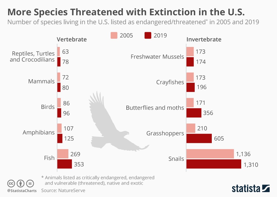The amendments to the ESA have caused political tensions and raised concerns amongst environmental groups about what changes mean for wildlife and ecosystems in the United States. These changes have come at a time of scientific insights into the impacts of climate change on the world. NatureServe, a nonprofit whose assessments help to inform decisions regarding which animals are considered for protection under the ESA, released a report that found most taxa in the United States had more species added under the ESA from 2005 to 2019. The IPBES released a report in May 2019 that one million plant and animal species are at risk of extinction. This report’s startling findings demonstrates the importance of and need for comprehensive environmental laws and regulations nationally and internationally, as well as the need to understand what exactly what they entail and mean for the future of wildlife in America.