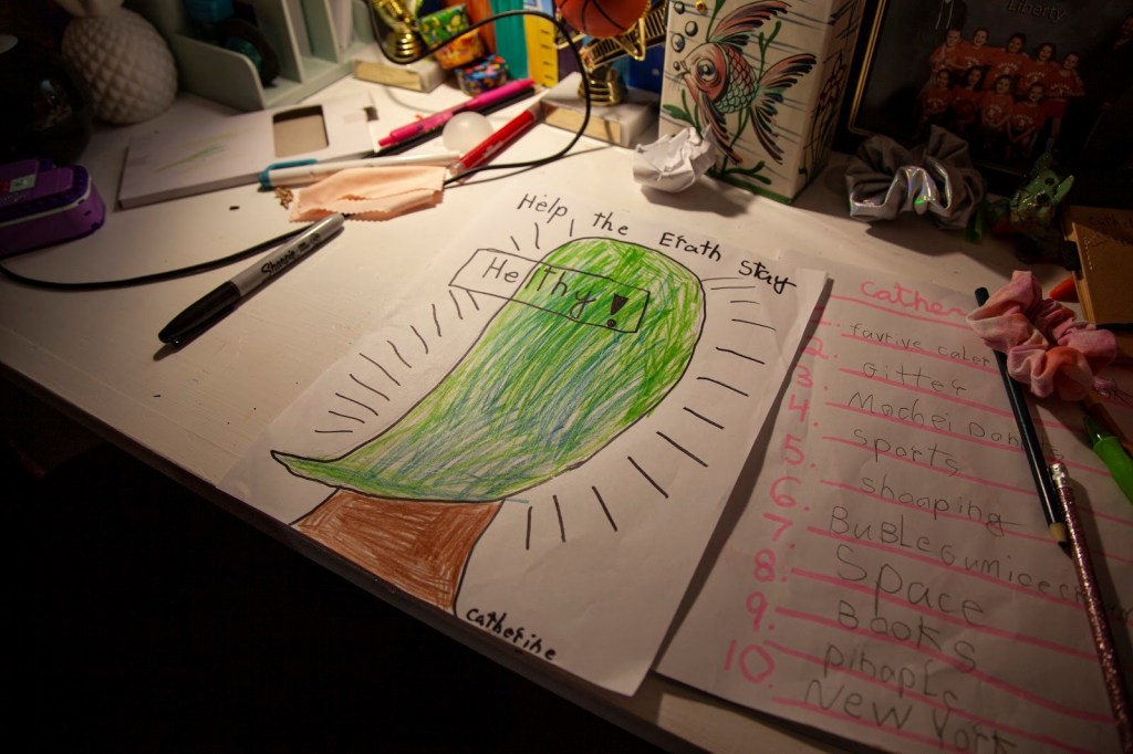 Catherine doesn’t know if she feels the impacts of climate change, but she has no problem making adjustments to reduce her impact on the planet. She carpools to school, she doesn’t use plastic bottles, and she reuses her lunch containers. She hates when people litter. Just the sight of it fills her with sadness. “They’re polluting and polluting is bad for the environment,” she explains.