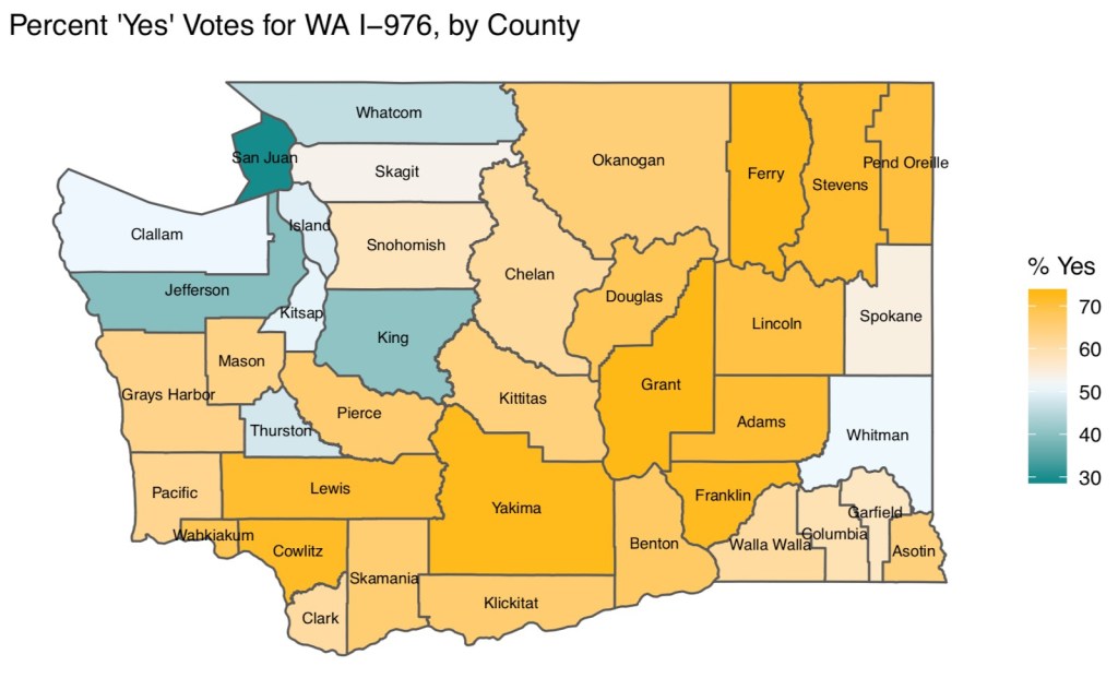 The map above, which shows the percent support for I-976 by county, shows a fairly clear dichotomy across the state. There is a sash of yellow from the northeast to the southwest corners, showing the ~70% support that counties like Yakima County and Ferry County presented at the polls. If the ballot explicitly stated the implications of the initiative, we could possibly conclude that lifestyles and values towards taxes and public transit are divergent across the state. But in this case, what can we actually glean from this map? After rereading the initiative’s ballot text and the full text, I find the wording to be unclear and not divulgent of all initiative implications; I don’t think we can deduce much from this map. If voters can’t understand the text of the initiative, the map could mean something else entirely – it might, for example, show differences in local newspaper voting guides’ translation of measures into layperson language. Or it might show differences in where Tim Eyman dedicated his campaign efforts and preached his own translation of the initiative. Therefore, what happened at the polls last November perhaps has nothing to do with voters’ perceptions of public transit.