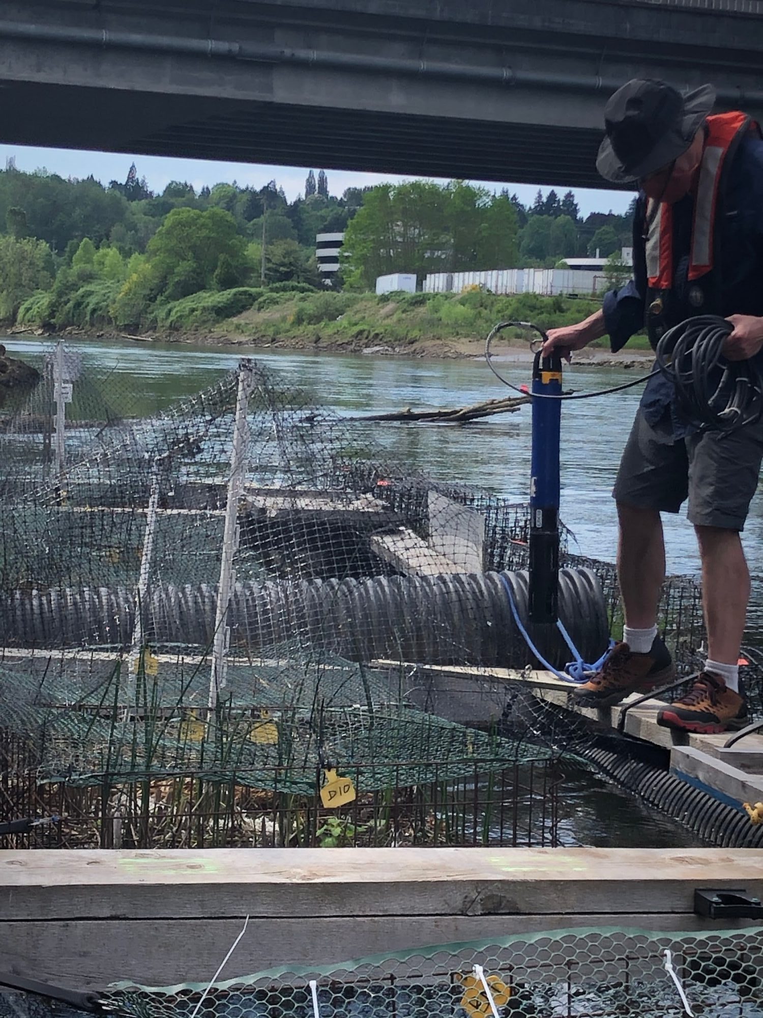 Essentially, we wanted to see if our BioBarges would create pockets of usable habitat for juvenile salmon in industrialized, polluted rivers that further challenge their survival. As the water quality lead, my role was to gather water quality data weekly from March through July.