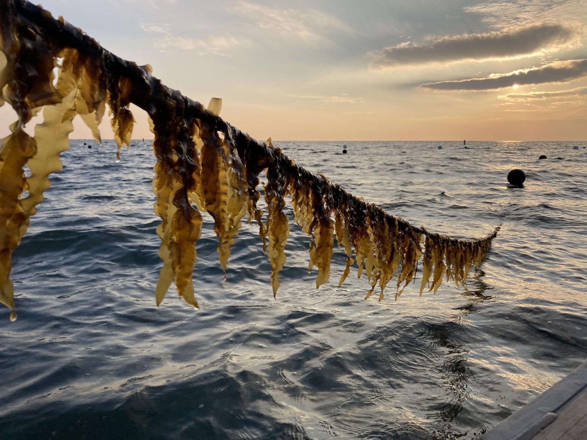 In GreenWave’s setup, seaweed, scallops, and mussels hang down from buoys, while beneath them hang cages with oysters and clams. This efficient use of space allows the system to provide a laundry list of benefits, including decreasing carbon and nitrogen in the water and increasing oxygen to regenerate and restore local habitat. Through photosynthesis, seaweed can take up carbon in the surrounding water, buffering the impacts of varying levels of ocean acidification locally. A collaborative team, led by the Puget Sound Restoration Fund and including SMEA’s Terrie Klinger, is currently investigating these buffering capabilities in sugar kelp (Saccharina latissima), the favored kelp crop of Thimble Island Ocean Farm. Meanwhile, the shellfish in the ROF system are filter feeders that suck up nutrient pollution, like nitrogen from fertilizer runoff. Unchecked, these excess nutrients can cause algal blooms, and when microorganisms decompose that algae, they use up oxygen, creating oxygen-deprived dead zones. Kelp absorbs these excess nutrients too, and also provides oxygen through photosynthesis.