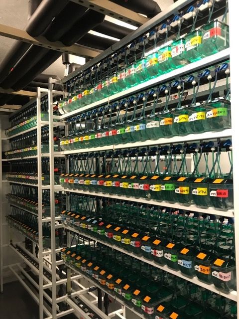 I work in a refrigerated box most of the time, but it probably has a fancier name like “climate controlled wet laboratory.” If you’ve ever seen a restaurant’s walk-in freezer or refrigerator, that’s kind of what I work in. You could call it a refrigerated library, too, but on a really small scale, if you had a library the size of your bedroom and every bookcase had hundreds of fish tanks on it instead of books. For my research, I run experiments with hundreds or thousands of fish in very controlled environments.
