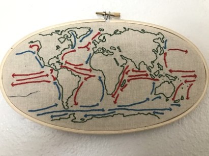 I love the mindfulness of embroidering, and when my work is complete, I can reflect on the details of each step. Often I find myself focusing on the negative aspects of human impact on the world, and these embroideries help me appreciate the beauty and connection of it all. I was very excited to embroider this piece because it is a scientific diagram that I learned early in my marine science education. I loved the idea that I could replicate this diagram in my own artistic manner while retaining the information it conveys.