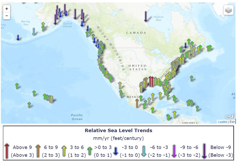 In its most recent report, the United Nations Intergovernmental Panel on Climate Change (IPCC) continued to emphasize the speed with which global sea levels are rising, contributing to coastal flooding and erosion. High sea levels that historically have occurred once-a-century may become once-a-year by 2100. The US is no exception to this trend. The map below, a screenshot from NOAA’s interactive Sea Level Trend viewer, reveals quickly to the eye that sea levels are rising, at varying speeds, on all of our coasts.