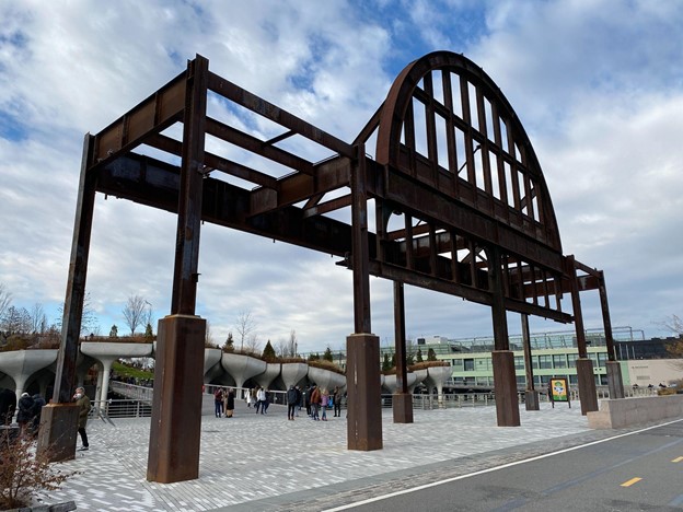 December 2021 – With the era of the steamship long gone, the metal arch of Pier 54 is the only portion of it still standing today. Behind is Little Island, a popular new park built in place of the old pier. Photo credit: Gabriela Carr.