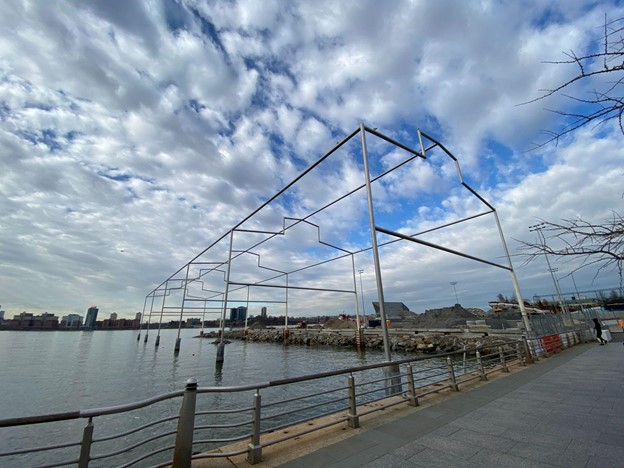 December 2021 – David Hammons’ 2014-2021 piece, “Day’s End,” recreates the outline of the warehouse that once stood on Pier 52. The installation points to a curiosity of present-day New Yorkers, such as Hammons himself, concerning the past of this changing waterfront and what once stood on those pilings. Photo credit: Gabriela Carr.