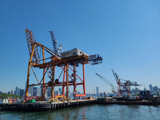 Summer 2021 – Gantry cranes visible on the Brooklyn waterfront at Red Hook Terminal. The Financial District of Lower Manhattan can be seen in the background on the left. This is one of the few places in New York City, along with Staten Island, that serves container ships. Since 1921 the Ports of New York and New Jersey have been combined to increase cooperation. Ships are primarily unloaded in New Jersey, having moved away from densely urbanized parts of New York City to facilitate extensive land-based transportation. The Elizabeth-Port Authority Marine Terminal, part of this joint port, was the world’s first to serve container ships, beginning in 1962. Photo credit: Ben Carr, used with permission.