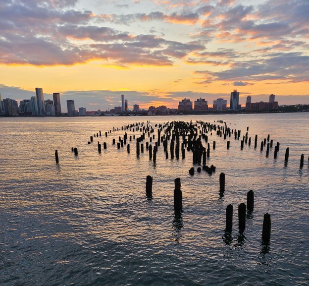 Winter 2020-2021 – The pilings of many steamship piers, such as these on Manhattan’s Lower West Side, have been left standing as parks are built on piers above and around them. These structures continue to serve as valuable habitat for marine life. Photo credit: Ben Carr, used with permission.