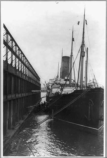 1912 – The RMS Carpathia, docked at Pier 54. This photo was taken the same year that the ship brought survivors of the RMS Titanic safely to New York. At the time Pier 54 was dedicated to Cunard Line ships, of which the Carpathia was one. The Titanic was meant to dock a few piers up, at the White Star Lines pier. However, although at the time the Cunard and White Star lines were separate companies, and rivals at that, today the remaining arch of Pier 54 still faintly bears the words “Cunard White Star.” The lines merged later in the century under pressure from the British government during World War II. This merger is a somewhat poignant coincidence in light of the relationship between the Carpathia and the Titanic. Photo credit: Unknown, available in the public domain.