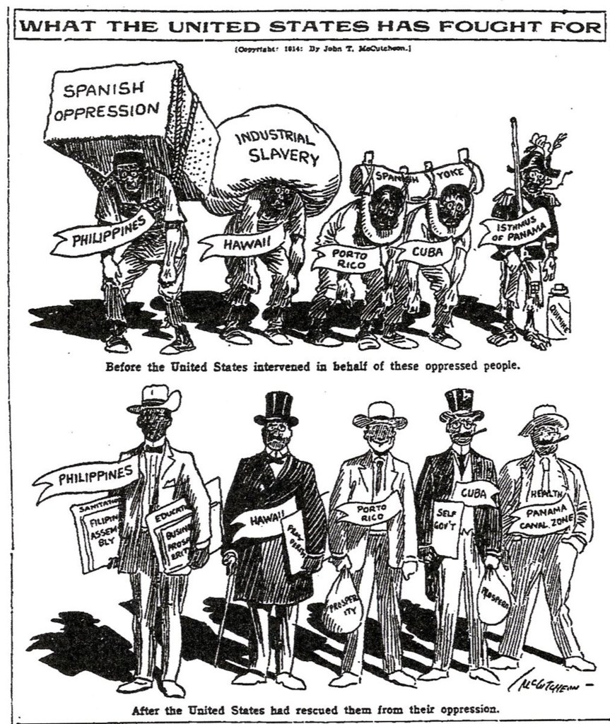 The U.S. has an extensive history of colonialism and imperialism inextricably tied to its economic, military, and cultural influence. However, the turning point for American imperial engagements is marked by the Spanish-American and Philippine-American Wars, which ranged from 1898 to 1902. These wars made clear the imperialistic nature of the U.S. The U.S. claims to have “freed” the Philippines from imperialist Spain only to purchase and colonize the islands under the guise of protecting freedom and democracy. After this point, the United States became increasingly involved in international politics and affairs, inserting itself into discussions and conflicts as the “protector of democracy.”
