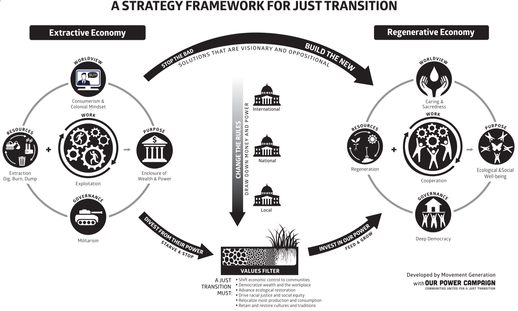 A strategy framework for a just transition, moving away from an extractive economy towards a regenerative economy. Image credit: Movement Generation’s Just Transition Zine, designed by Micah Bazant, used with permission.