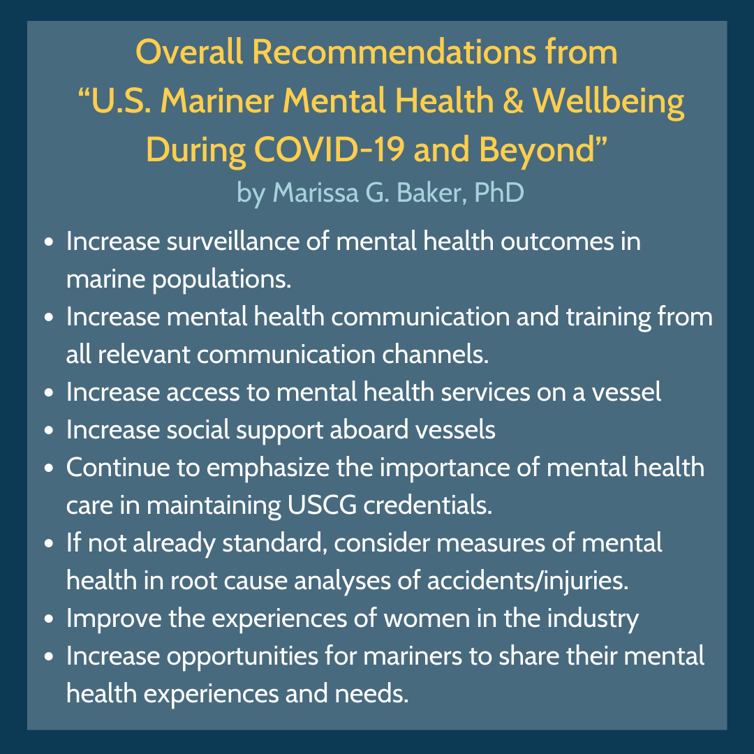 In an attempt to capture information on U.S. mariners, Dr. Marissa Baker, from the Environmental & Occupational Health Sciences Department at the University of Washington, conducted a study entitled “U.S. Mariner Mental Health & Wellbeing During COVID-19 and Beyond.” Dr. Baker partnered with the U.S. Committee on the Marine Transportation System’s COVID-19 Working Group, the U.S. Department of Transportation Maritime Administration, and the Ship Operations Cooperative Program, suggesting there is support for more mental health research from U.S. agencies. Dr. Baker’s study measured mental health conditions, job satisfaction, and several quality-of-life indicators.