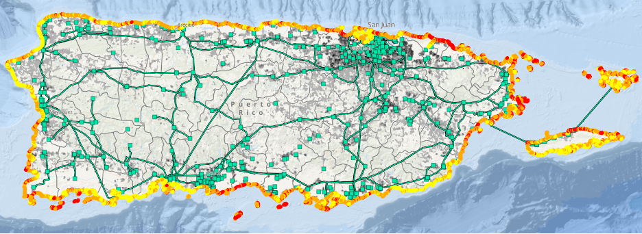 The Puerto Rico Hazard Viewer with layers toggled for coastal hazard risk (with habitats present) and energy infrastructure. Users can toggle more layers to reveal spatial relationships between hazard risk, communities, and ecosystems. Map image courtesy of Max Perkins, shared with permission.